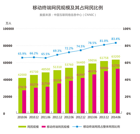 中國移動(dòng)互聯(lián)網(wǎng)用戶已超PC網(wǎng)民。據(jù)中國互聯(lián)網(wǎng)絡(luò)信息中心(CNNIC)數(shù)據(jù)顯示,截至2014年6月,中國移動(dòng)互聯(lián)網(wǎng)用戶為5.27億,覆蓋率達(dá)83.4%, 首頁次超越傳統(tǒng)PC整體80.9%的使用率,移動(dòng)互聯(lián)網(wǎng)用戶成為 大上網(wǎng)群體。